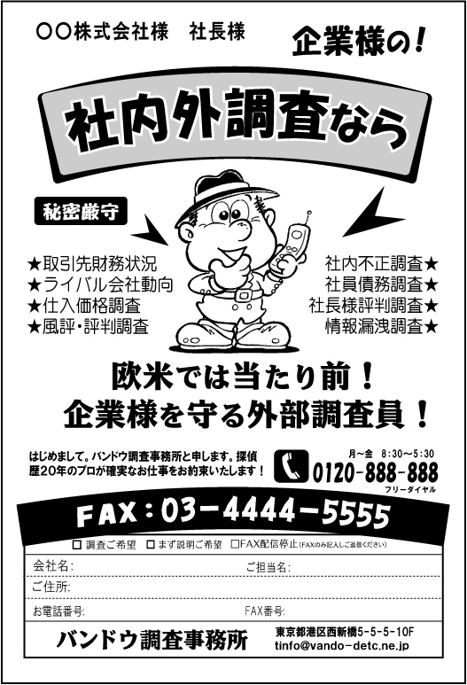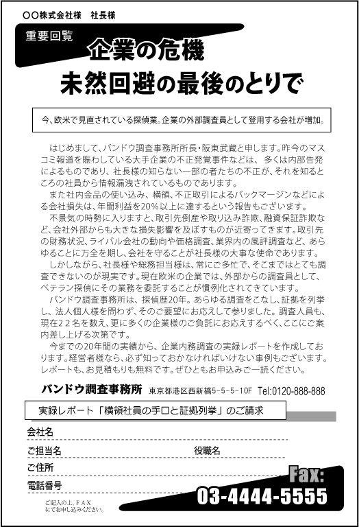 ビフォー原稿は、新聞や雑誌、フライヤーなどのチラシ似のFAXDM原稿だが、ターゲットは都心のオフィス企業の社長や総務。これでは、即ゴミ箱行きになりそうだ。企業関係の調査業務なので、もっとクールなイメージで、ビジネスライクに、誠実な文章で訴えたい…
